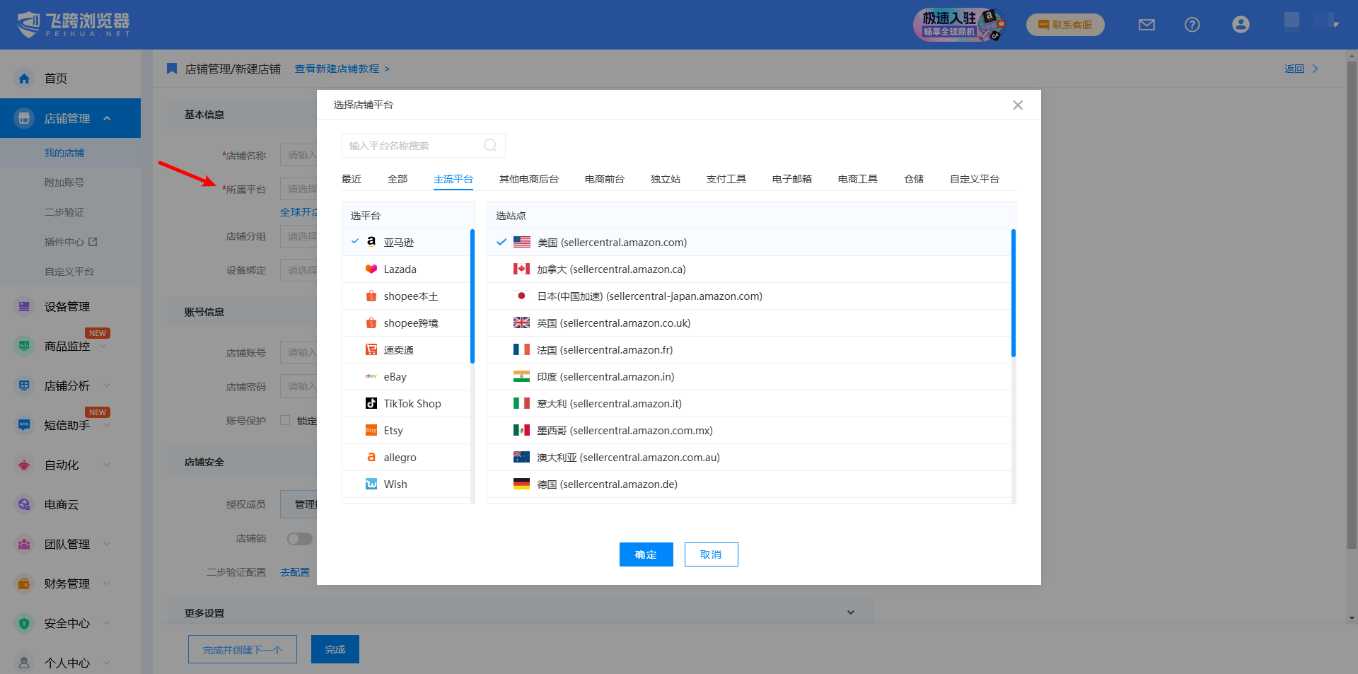 该篇文档介绍了基础的店铺创建流程,以及相关概念。 用户可先通读此篇了解情况,若您店铺较多,可使用[批量导入功能](https://www.feikua.net/doc/283.html) ------------ ## 1 进入创建店铺页 1.用户登录账号后,会自动进入控制台;也可在飞跨浏览器首页,点击【控制台】,进入后台页面,  或者使用飞跨十周年版,点击【店铺】→【新建店铺】,在内置浏览器登录之后,跳转到【店铺管理】;  2.选择左侧边栏【店铺管理】,并点击【新建店铺】,进入新建店铺页面;  ## 2 填写店铺基础信息 ### 2.1 填写基本信息 新建店铺页的第一部分是基本信息,店铺名称与所属平台是必填项。 #### 2.1.1 填写店铺名称[必填] 店铺名称可自由命名,用于区分不同店铺。 #### 2.1.2 选择所属平台[必填] 可以在【选平台】框框中拉动下拉条选取要使用的平台和站点,也可以直接在上方搜索框中输入平台名称搜索。若找不到想使用的平台,还可选择最右一栏添加[自定义平台](https://www.feikua.net/doc/278.html)。  #### 2.1.3 设置店铺分组 用户可以为新店铺设置分组,可以勾选建立好的分组,若没有提前建立分组,在创建店铺页面也可实现现场新建。  #### 2.1.4 设备绑定 用户可以绑定已经购买的设备,若没有提前购买好设备在创建店铺页面也可实现现场购买绑定,也可等店铺创建好以后再去绑定店铺。  ### 2.2 账号信息 #### 2.2.1 店铺账号与店铺密码 店铺账号与店铺密码填写的是所属平台对应的账号密码,若填写完全,打开店铺将能自动填充账号密码。此信息将加密处理,不泄露隐私。 #### 2.2.2 账号保护 用户创建店铺时,还可以设置**账号保护**功能,勾选锁定账号后,在店铺环境内将禁止输入和修改账号,可分别对店铺账号和附加账号设置; ①锁定店铺账号 用户可以设置账号保护功能,勾选【锁定店铺账号】后,在店铺环境内将不可手动输入和修改账号。 ②锁定附加账号 勾选【锁定附加账号】后,仅禁止在店铺环境内手动修改附加账号,可通过附加账号助手添加新的账号。  ### 2.3 店铺安全 #### 2.3.1 授权成员 在创建店铺时,可以把新店铺授权给成员,具体操作请看下图! 授权成员功能只能在事先添加好成员的情况下才能进行。[如何添加成员](https://www.feikua.net/doc/287.html)  #### 2.3.2 店铺锁 店铺锁的作用是同一时间只允许一个账号启用店铺,防止操作重复出错的情况; #### 2.3.3 二步验证 为店铺配置二步验证,可以自动获取验证码,减少了索取验证码的时间,加强效率; ### 2.4 更多设置 #### 2.4.1 任务栏图标 为新店铺设置任务栏图标,用户若有多个店铺,可以使用不同的店铺图标颜色,便于分辨。 #### 2.4.2 网站通知 为了防止过多无关信息干扰,飞跨是默认关闭网站通知的,用户需要的话可以手动在此开启网站通知。 开启网站通知后,在飞跨浏览器十周年版6.2.0及以上版本,开启消息提示音【图标闪烁提醒】,当有网站消息时即会图标闪烁提醒。  #### 2.4.3 禁止加载图片、禁止加载视频 为了防止用户流量不够用的情况,用户可以手动开启禁止加载图片、禁止加载视频,从而达到节省流量的目的。  ####2.4.4 店铺随机指纹 开启后,每次打开店铺时,均随机店铺指纹。 ## 3 店铺环境设置 在浏览器环境设置部分,飞跨浏览器提供了【简单配置模式】和【专家配置模式】。建议用户选用简单配置,专家配置模式操作较繁琐复杂,非专业人员请勿擅自修改。若为专业技术人员,选用专家模式可依照提示填写。 ### 3.1 简单配置模式 【简单配置模式】是默认配置最优通用防护策略,已自动随机填充,用户可按需求改选其他内容。 Chrome内核 #### 3.1.1 浏览器UA UA信息为浏览器用户代理信息,可系统随机匹配,也可通过点击“换一换”选择自己想要的环境; **浏览器**提供各版本的chrome可选,可点击下拉条选择,也可点击“换一换”随机更换浏览器; **操作系统**同时提供Windows和Mac OS版本;  #### 3.1.2 语言 **语言**默认基于IP生成的国家语言,用户也可根据店铺平台对应的区域,选择环境语言,如图“繁体中文”、“日语”等; 这部分语言设置的是浏览器指纹应该的语言环境,如果想修改浏览器指纹,可参考:[如何设置店铺语言环境](https://www.feikua.net/doc/466.html) #### 3.1.3 cookie同步 cookies:飞跨浏览器提供三种Cookies记录同步方式,默认选用按店铺同步。 - 按店铺同步cookie:同个店铺下不同成员的不同电脑均会同步使用相同的cookie(使用不同电脑时减少重新登录或二步验证的频率,适合不同成员使用相同店铺账号的情况)。 - 按用户同步cookie:同个店铺下且同个成员的不同电脑才会同步使用相同的cookie(使用不同电脑时减少重新登录或二步验证的频率,适合不同成员使用不同店铺账号的情况)。 - 不同步店铺cookie:cookie仅保存在电脑本机,不同电脑之间均不会同步到该cookie。 若用户想使用原本常用的浏览器环境的cookie和UA信息,可以[点击此处](https://www.feikua.net/doc/261.html)了解飞跨的cookie&UA迁移插件-安装流程。 ### 3.2 专家配置 专家配置模式操作较繁琐复杂,非专业人员请勿擅自修改。若为专业技术人员,选用专家模式可依照提示填写。 若是想修改地理位置,可在【Navigator 参数】→【地理位置】选择询问或者允许的状态下,关闭基于IP生成对应的地理位置,对经度、纬度、精度(米)填写。  ## 4 完成创建 店铺信息填写完毕,点击【完成】即可完成新建店铺,点击【完成并创建下一个】即