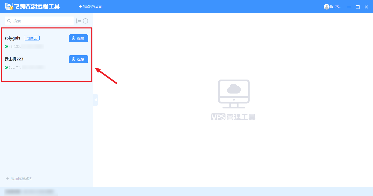 飞跨VPS远程工具是一款针对跨境电商行业开发的VPS(云服务器)管理软件。解决跨境卖家使用VPS管理店铺中遇到的卡顿、批量管理、团队协作等问题,让跨境店铺运营更加流畅、安全、高效。 飞跨VPS远程工具除了能和飞跨的电商云产品无缝对接使用,还能添加其他VPS机器,在此进行统一管理。 以下介绍飞跨VPS远程工具的详细使用指南 ## 1安装下载飞跨VPS远程工具 1.在飞跨首页的导航栏,选择【电商云】,并点击如下页面中的【VPS远程工具】,在跳出来的页面点击免费下载;   2.下载好后,点击蓝字【打开文件】,开始进行安装;  3.待安装完成,用户即可在桌面看到飞跨VPS远程工具图标  ## 2 连接使用电商云VPS设备 1.双击图标打开【飞跨VPS远程工具】,将看到如下页面;  2.点击右上角的【登录】,将弹出与飞跨浏览器相对应的密码登录窗口,用户在这里填写飞跨的账号密码,即可完成登录;  3.登录成功后,页面中间将弹出以下画面。提示是否进行【离线主机导入】; 飞跨VPS远程工具可以在不用登录的状态使用非飞跨旗下的VPS机器,但没有和相应账号挂钩就代表着该机器信息不能被储存和记住,每次使用都要重新输入机器信息才可使用,麻烦得多。这里的【离线主机导入】功能,就是将这些“无账号主机”“离线主机”的信息存储到登录的飞跨账号中,方便统一使用管理。  4.登录后,即可在该页面左侧看到账户下的电商云VPS机器;  5.点击电商云右侧的【连接】按钮后,即可打开该台VPS机器,将在右侧看到VPS的真实画面,就可以开始进行操作使用啦。  6.当不需要使用机器时,点击【断开】即可关闭VPS。  ## 3 添加其他远程桌面 飞跨VPS远程工具除了能使用飞跨电商云的VPS设备,也支持添加其他VPS设备。以下介绍添加步骤 1.点击左上角的【+添加远程桌面】,页面中将弹出添加服务器的信息填写表;  2.表格中,连接名称就是该台服务器的名称,可以自定义命名,便于识记。IP、端口、用户名、密码就需要准确填写要使用的服务器信息。 填写完整后,点击保存;  3.即可看到该VPS服务器已加入左侧机器栏中,此时可点击机器右侧的【连接】按钮  4.与电商云机器相同,连接机器后,右侧区域将展示VPS的实时画面,可直接在此操作使用。 不需要使用时,再点击机器右侧的【断开】按钮,即可。