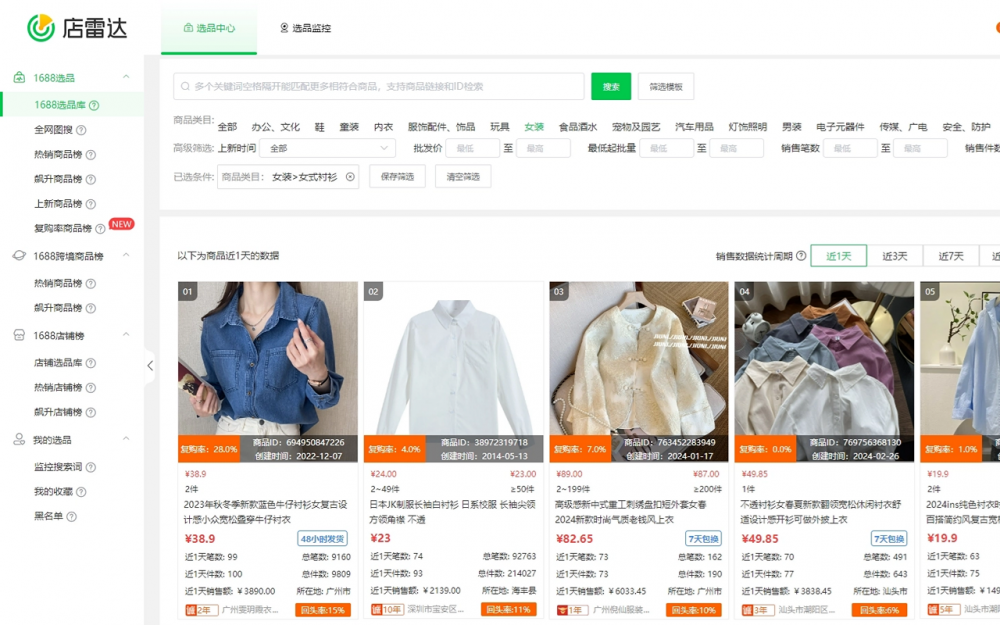 2. 店雷达提供1688热销、飙升、上新等多种商品榜单,助力挖掘市场受欢迎和潜力品的高效选款跟款,紧跟市场潮流;进行推广和销售。