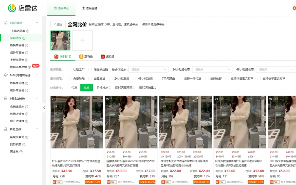 店雷达赋能1688、亚马逊、速卖通、Temu等平台卖家,提供专业高效的选品工具和运营插件。支持查找1688优质货源及供应商、一键全网图搜比价。