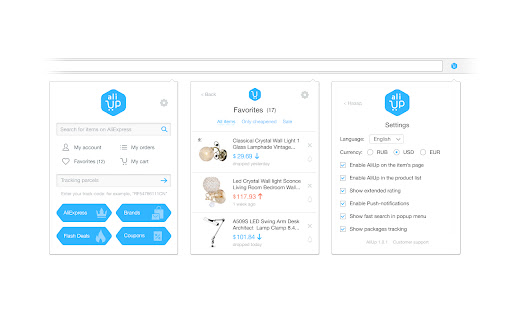 Extension AliUp is an independent service. AliUp is not part of AliExpress and does not have an affiliation with, formal relationship with, or endorsement from AliExpress or Alibaba Group. The extension shows the seller's rating, helps to track discounts and to check the real price of the goods. ★ Price history. The graph is displayed on the product page and shows the real discounts. ★ Seller check. A detailed seller's rating is calculated based on reviews and ratings of goods, price dynamics and some other metrics. ★ Favorites and price tracking. Add products to your wishlist, AliUp Price Tracker will follow prices and send you notifications when the goods become cheaper or again appear in stock. ★ Similar goods. Searching for analogues from other sellers on AliExpress will help you to choose the best offer with the lowest price from a seller with a good rating. ★ Menu for quick access to necessary tools and functions. Tracking orders, searching goods from AliExpress, favorites, popular sections and quick access links. AliUp is compatible with popular cashback services such as ePN, Еbаtеs, Letyshops and others, as well as with popular extensions for dropshipping with AliExpress. The extension functionality is designed to simplify shopping. The price history will be very useful during big sales, such as Global Shopping Festival 11.11, AliExpress Birthday and Black Friday, as the vast majority of sellers raise prices before sales, then to make a discount. Seller ratings, quick access menu, search for similar goods and quick search will make easier frequent purchases and selection of goods for dropshipping. The extension is completely free for users. AliUp Assistant does not insert ads on sites, does not contain any malicious code and does not install viruses. The current version of the extension works on aliexpress.com and aliexpress.us. Are you still undecided? Install AliUp right now and start buying cheaper and safer! Send your questions and suggestions related to the service to support@aliup.info