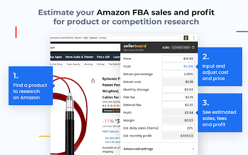 sellerboard FBA Profit Calculator helps Amazon sellers research and source new products for selling on Amazon. The plugin displays estimates of Amazon fees (e.g., FBA fee, referral fee, storage fee) directly on the Amazon product detail page. Additionally, the sellerboard FBA Profit Calculator estimates daily and monthly sales of a product and calculates the potential profit per day and month. Just enter the buying price, and the tool will automatically do the rest. You can edit all calculation parameters manually (e.g., edit the selling price, product dimensions for FBA fee estimation, etc.). The sellerboard FBA Profit Calculator takes into account the following parameters: - The selling price of the product - All Amazon fees (incl. FBA fee, Referral fee, and Monthly Storage fee). - Cost of returns based on an editable return rate (e.g. 2%) - Estimated daily and monthly sales - Estimated profit and margin The sales are estimated based on the Best Seller Rank of the product (BSR). Be aware that actual sales and profit may be different. The sellerboard FBA Profit Calculator plugin is completely free! Supported marketplaces: Canada, UK, US, Germany, France, Italy and Spain If you have any questions, ideas, or feedback, please contact us: support@sellerboard.com. This extension is presented by sellerboard.com, the world's most accurate and most user-friendly profit analytics tool for Amazon sellers. Check out our demo and get a free trial: sellerboard.com