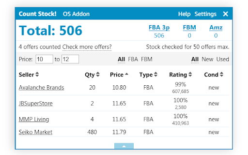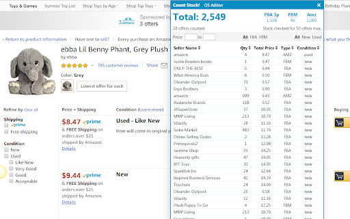 Free stock counter for Amazon sellers with unlimited daily product checks. This extension will show the inventory counts for the different offers on an Amazon listing. You do not need to create an account or signup for anything. You can add the extension and start using it immediately. Works for all Amazon domains. Important Notice: Chrome will soon disable this extension. It uses an older version of Manifest that Chrome no longer supports; please consider migrating to Firefox to continue using it: https://addons.mozilla.org/en-US/firefox/addon/online-seller-addon/ How to use the Amazon stock checker: Add the extension to your browser (click the Add to Chrome button in the top right and confirm) Visit a product detail page on Amazon.com, and click the "Count Stock!" button or click the OS Addon icon in the top right of your browser. OS Addon does not collect or store data outside your local extension. Premium features may be added in the future, but the stock counter is completely free to use. Permissions: It can read and change data on all: - www.amazon.com, smile.amazon.com (and all the regional amazon tld domains) - allows the extension to appear and show quantity data on amazon websites - sellercentral.amazon.com (and all the regional amazon tld domains) - allows the extension to use amazon revenue calculator Disclaimer: The extension uses Google Analytics to collect extension usage statistics to help improve user experience. If you want to opt-out of Google Analytics tracking, please visit http://tools.google.com/dlpage/gaoptout Privacy Policy: http://dmitry.artamoshkin.com/privacy.html