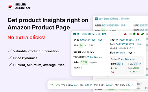 What Is Seller Assistant? Seller Assistant is a Product Research Software for selling on Amazon. It combines two extensions: Seller Assistant Browser Extension, and IP-Alert Chrome Extension by Seller Assistant, Amazon seller tools: Bulk Restrictions Checker and UPC/EAN to ASIN converter, and features: Side Panel View, FBM&FBA Profit Calculator, Quick View, ASIN Grabber, Stock Checker, IP Alert, and Restrictions Checker. Seller Assistant shows all necessary product data on Amazon search, product, and inventory pages, and on any website to help you find high-margin deals. By using this FBA and FBM product sourcing software, you can easily identify products that have the potential to be sold well on Amazon. Over 50,000 users worldwide trust Seller Assistant. It has analyzed over 250 million goods and discovered over 2 million high-margin arbitrage deals. Supported Amazon marketplaces all over the world. Start a 14-day FREE trial, no need for payment details. After the trial, choose a plan that suits you the most, from Free to Start ($15,99/month) or Pro ($29,99/month). What Can You Do with Seller Assistant? Transform your product sourcing process with clear, real-time data that helps you select the best products to sell on Amazon. Research products on any website and identify the most profitable deals for your Amazon FBA business. ✔️ Research in-depth product data on Amazon product pages (ASIN, BSR, category, product dimensions, size tiers, and more) with the Product Page View; ✔️Check how well the product sells on Amazon and how many product units you can sell monthly with Sales Estimator; ✔️Calculate your break-even point, targeted ROI price, and minimum price for Amazon Repricer; ✔️Estimate product profitability, calculate Amazon fees, logistics costs, VAT and taxes for your products with FBA calculator and FBM calculator; ✔️Identify competition level by the FBA and FBM seller offer count, prices, and rating; ✔️Determine competitor stock numbers with the Stock Checker; ✔️Check products for intellectual property complaints and their type with the unique IP Alert feature; ✔️Find out if you can sell a product on your Amazon account; ✔️See product alerts (restrictions, hazmat, heavy and bulky, meltable, and many more) with Notifications; ✔️Check restrictions in bulk up to 5000 ASINs with Bulk Restrictions Checker; ✔️Identify best-selling variations with Variation Viewer; ✔️Find and research deals on any supplier’s website with Side Panel View; ✔️Quickly lookup product suppliers by title, model, and UPC on Google, eBay, Alibaba, Walmart, and other popular websites; ✔️Quickly identify potential deals on Amazon search pages with Quick View widget; ✔️Find match between supplier and Amazon products with UPC to ASIN converter; ✔️Grab valuable ASIN details from search pages and storefronts with Amazon ASIN Grabber; ✔️Look up product sales history on the integrated Keepa charts; ✔️Add custom notes to products in order to save your ideas, Likes, and Dislikes with Notes; ✔️Export Amazon product data to Google Sheets in one click; ✔️Securely cooperate with virtual assistants by creating sub-accounts for VAs. Solutions for Amazon Sellers Seller Assistant offers the best pro-level user-friendly product sourcing solutions for online arbitrage, wholesale sellers, dropshippers, and product research virtual assistants. With it, you can instantly select winning products to sell on Amazon right now! Online arbitrage sellers Seller Assistant helps Amazon online arbitrage sellers do product research directly on Amazon product and search pages and on any supplier’s website, instantly calculate profit and save data to Google Sheets in one click. The unique IP-Alert feature secures Seller Central from costly IP complaints. Bulk Restriction Checker lets you validate in bulk which products you are eligible to sell on your account. The Side Panel View and Quick Links feature let you find product suppliers on other retailer’s platforms in one click and discover profitable deals. Wholesale sellers Seller Assistant offers a powerful toolkit for wholesale sellers looking for high-margin products. With Seller Assistant’s browser extension, you can quickly analyze your supplier products and identify what is worth selling, and will bring you the best margins. Unique functionalities such as Bulk Restriction Checker check the selling eligibility in bulk, UPC/EAN to ASIN Converter matches manufacturer UPCs and EANs to Amazon ASINs, and advanced IP Alert help proactively avoid products with Amazon policy violations. Dropshippers Seller Assistant is a professional product sourcing solution for Amazon dropshippers who must research many products and wait until customers buy them. It lets you quickly find high-profit and low-competition products and ensure they will pose no risk when you sell them. With Seller Assistant showing all product metrics in one place: IP-Alert - to protect you from intellectual property claims; Bulk Restriction Checker - to conveniently verify product restrictions, you will easily outperform your competition. Additionally, the Side Panel View and Quick Links features allows dropshippers to look up product suppliers on other retailer’s stores in one click and find profitable deals. Amazon virtual assistants Seller Assistant is the best tool for product sourcing VAs. It incorporates all the professional product sourcing features you need to effectively find high-profit deals and offers great value for money. Seller Assistant has special solutions for businesses working with virtual assistants — sub-accounts for virtual assistants that provide virtual assistants secure access to a seller account. A good alternative to RevSeller, SellerAmp SAS, and BuyBotPro