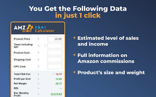 使用者友好的One-click FBA计算器能为您计算亚马逊佣金和总利润。无需输入ASIN,只需在亚马逊网站的产品页面上启动外挂程序即可。 该扩展功能在哪些站点可以使用? -美国 -日本 -英国 -加拿大 -墨西哥 -德国 -西班牙 -法国 -意大利 -印度 -沙特阿拉伯 -阿联酋 -澳大利亚 -巴西 用One-click FBA计算器更快地赚更多钱。 请不要犹豫,通过e-mail与我们联系support@amzscout.net
