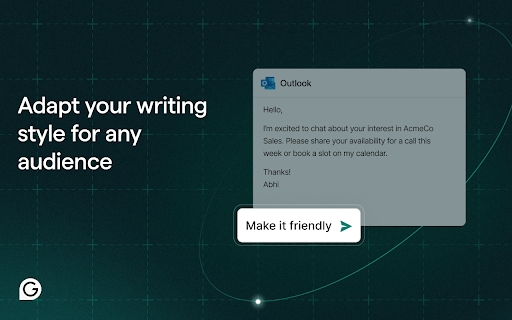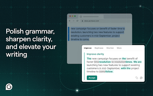 Grammarly for Chrome is your always-on AI partner for clearer, more compelling communication. From brainstorming ideas to final edits, Grammarly’s advanced AI helps you write faster and with more confidence. It works across everything you write, whether it’s an email, a school paper, or a business proposal. Advanced AI support you can count on: • Generate one-click drafts to help you start faster • Build outlines to organize ideas clearly • Rewrite sentences for flow, clarity, and engagement • Adjust tone and word choice for any audience • Check originality with built-in plagiarism detection and AI content safeguards And now, with Superhuman Go, you can go beyond writing. Go works alongside you in Chrome to streamline tasks and minimize interruptions—combining Grammarly’s trusted AI writing support with tools that help you stay focused and productive. Currently available as an opt-in beta, Go can be enabled directly from your Chrome extension settings. ➤ How it works Grammarly integrates directly into your browser, offering real-time suggestions as you type in Gmail, Google Docs, LinkedIn, and across 500,000+ other sites. • See corrections and improvements instantly • Expand edits to learn the “why” and strengthen your skills • Stay focused with Go, the AI assistant that understands what you’re working on and offers proactive support ➤ What’s included? Free – Essential tools for confident writing: • Grammar, spelling, and punctuation corrections • Suggestions to improve clarity and tone • Auto-citations in APA, MLA, and Chicago style • AI help to brainstorm, draft, and rewrite Pro – Everything in Free, plus: • Sentence rewrites for clarity, flow, and engagement • Tone, formality, and word choice enhancements • Audience insights to guide how your message is received • Feedback tailored for academic, technical, or professional work • Plagiarism detection and AI content checks • Team features like style guides and tone profiles (for business users) ➤ Trusted by millions “Grammarly rightfully touts itself as more than a simple spell checker ... Grammarly has a generative AI tool that helps you build outlines, brainstorm ideas, and even generate text.” —CNET “Grammarly’s advanced AI suggestions go beyond simply flagging grammatical mistakes to offer intelligent suggestions for improving clarity, tone, and conciseness for whatever you’re writing.” —Tom’s Guide “The beauty of this tool is that it uses AI to exemplify how your work can be enhanced rather than doing it for you.” —ZDNet ➤ More ways to use Grammarly • Desktop app: Use Grammarly in Word, Outlook, Slack, and more by downloading Grammarly on your desktop → www.grammarly.com/desktop • Docs: Grammarly’s dedicated writing space for deep focus and strategic insights → www.grammarly.com/docs ➤ Privacy and security you can trust Your data privacy and security are at the core of everything we do. Learn more about our user-first approach to trust and safety: www.grammarly.com/trust California residents, please see the California Privacy Notice: https://www.grammarly.com/privacy-policy#sectionSingleColumn_47y4NWiOf89wt12wcc6a74 By installing the extension, you agree to and acknowledge: www.grammarly.com/terms www.grammarly.com/privacy-policy