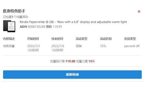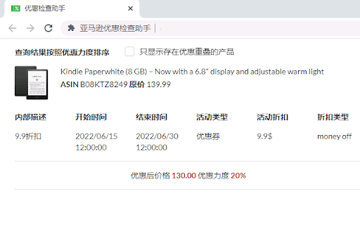 帮助亚马逊卖家检查促销优惠叠加情况。 面向运营人员: 在店铺创建优惠促销的界面, 自动检查同ASIN所有类型的优惠活动, 避免意外的优惠叠加滥用造成损失。 面向老板和管理人员: 在店铺首页和插件的“更多功能”页面,查询指定ASIN下所有的优惠活动,支持父ASIN查询; 支持一键查询当前时间段的所有优惠活动,查询结果按优惠力度排序,帮助管理人员第一时间发现异常的优惠。 ***主要功能介绍 *** 1. 检查优惠券、秒杀、促销、会员专享折扣、奥特莱斯、Listing优惠价的设置情况; 2. 自动计算出各产品总优惠后价格, 方便卖家轻松掌控优惠力度。