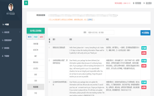 1、自定义消息模板,多店铺通用; 2、直接输入中文聊天,中/英/小语种一键翻译(谷歌翻译); 3、自动显示最新订单物流信息; 4、批量复制订单号,根据订单号批量发送消息/优惠券/产品等信息; 5、消息内容支持物流信息、目的国邮局和海关联系方式等参数; 6、新增发票功能; 7、纠纷页面显示最新物流信息、渠道、剩余时间。 教程:https://www.yuque.com/helps/im/sudo6q