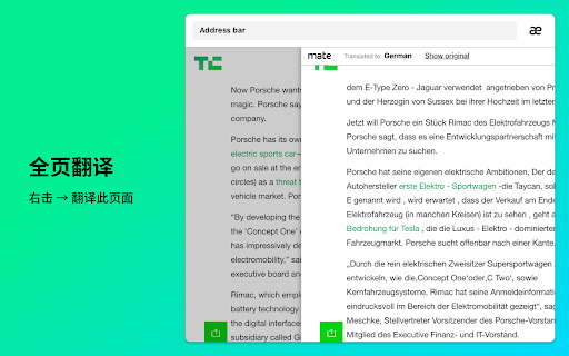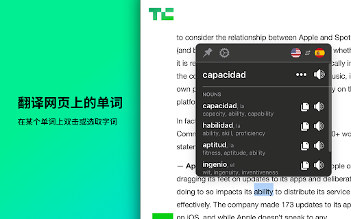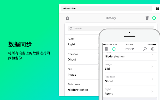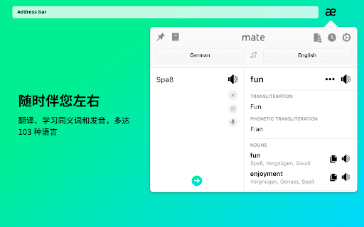 Mate Translate 的 Chrome 扩充套件就如同您现实生活中的得力助手,它可满足您所有的翻译需求。 Mate 可帮助您轻松翻译 103 种语言的单词、短语和文件,完全不费吹灰之力。 Mate 拥有全方位的词典可帮助您翻译页面,您甚至可以选择付费人工翻译。另外,您还可编辑专属您的短语集,加速您的语言学习。 Mate 不仅可帮助您阅读和写作,更能让您有完整的语言掌握和理解。今天就来下载您的 Mate Chrome 翻译工具,您再也不会迷失在外语之中。 您在网上阅读一篇文章时,碰巧有不会的单词吗?这时候,您只要选取网页上的任何文字,再使用快捷键,您就可以在不显眼的弹出窗口上查看翻译。 需要自行输入词句并翻译吗?您只需单击浏览器网址栏旁边的图标,即可开启 Mate 弹出窗口。在您需要时,它永远都在那里! 103 种语言 Mate 了解 103 种语言,还会教您如何正确发音。它会显示音标或罗马拼音,并能使用正确的口音来读出单词和句子。 全页翻译 只要单击鼠标,Mate 就会为您翻译整个网页!在任何页面上,只要使用上下文菜单中的“翻译此页面”功能,就可立即翻译为您想要的语言。 同步 Mate 可以将您所有设备上的翻译记录进行同步。无论是翻译记录还是查找的词典数据,都将在您有使用 Mate 的所有浏览器、iPhone 和 Mac 之间自动进行同步。 短语集 Mate 允许您根据最喜欢的主题来创建单词集。您可以轻松创建和管理单词列表,即使离线时也可使用。这项功能非常适合语言学习者或旅行者,因为他们总是需要查找特定的单词。试试我们的 Mate 短语集吧! 立即下载 Mate,免费获得您的翻译得力助手!目前全球已有 1,000,000 名用户在使用 Mate。