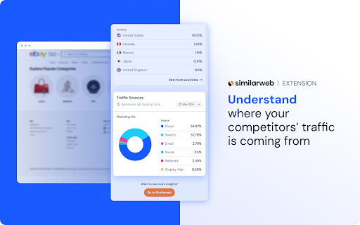 The Similarweb traffic analytics and keyword checker gives you the data to boost your SEO and marketing strategy through competitor analysis. Boost your SEO and digital marketing strategy with key metrics, including: - Visits Over Time - Top keywords - Traffic sources - Website ranking - Traffic by Geo FEATURES: Visits Over Time Reveal how many visits a website receives over time, its bounce rate, the number of pages visited per session, the number of monthly website visits, and a user’s average duration. Top Keywords Explore the top-performing keywords for any website. Website Rank Understand where a website ranks globally, in a particular country, and within its category. Geography Explore the top countries driving traffic, and see the percentage of visits from each country. Traffic Sources Discover where your competitors’ traffic is coming from, including direct, search, email, social, referrals, and display ads. The Similarweb website analytics and keyword finder is the ideal tool for website owners, marketers, and SEO professionals who want to monitor website ranking, analyze website traffic, and gain insights into their competitors' websites. Visit our website to learn more about our powerful digital intelligence solutions: https://www.similarweb.com/ Download the website ranking and keyword extension today for in-depth insights on every website. Download the extension today for in-depth insights on every website. The Similarweb extension provides you with website rankings as well as many other metrics. Before you can start using the extension, you’ll need to approve the collection of anonymized clickstream data, including All Hosts, WebRequest, WebRequestBlocking, Web Navigation, tabs, and storage. Data is collected on the domains that you browse. For more information regarding our data collection, we urge you to review our privacy policy before installing our add-on, available here: https://www.Similarweb.com/corp/legal/extension-privacy-policy/.
