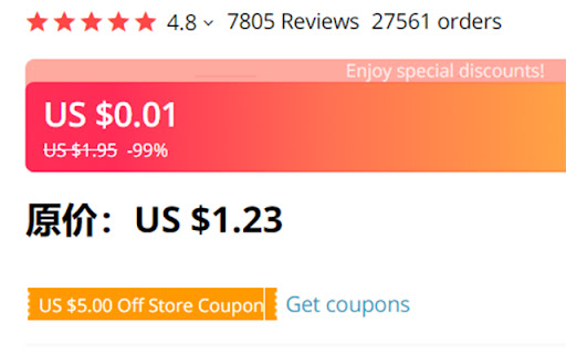 适配新版详情页面,建议更新 打开一个welcome deal/New User/big sale商品链接,选中SKU后显示原价 新增评价查看 新增显示orders AliExpress速卖通New User 原价透视 使用方法:打开速卖通New User 商品链接,即可以显示当前商品所选SKU原价 新增区域定价 【不支持小语种页面显示】 其它情况如果不显示,请升级一下浏览器 Bug反馈,新功能需求请联系我(微博:@梁栩谦)! vx 173 2816 0491 你的支持是我继续开发的动力! 祝大卖!