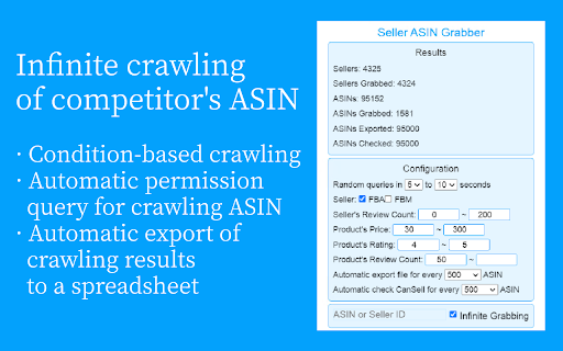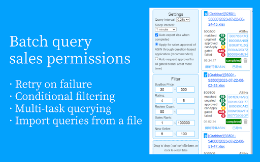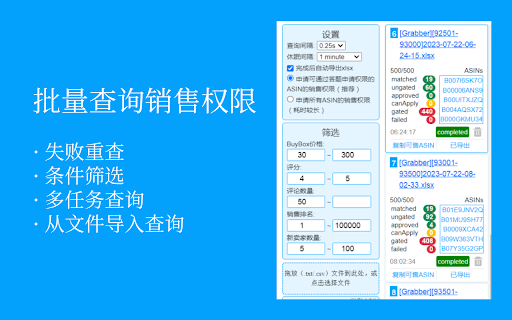 主要功能: ✔ 批量查询销售权限,支持多任务队列查询,支持从TXT、表格导入查询权限,查询完成自动处理表格后导出,告别表格繁琐操作。 ✔ 无限爬取竞对ASIN,无需手动一个一个卖家SPY了。 ✔ 自动申请销售权限,大大节约时间。 ✔ 支持“爬取→查权→申请权限”全自动,不用自己去找ASIN来查权,只需要检查利润、侵权等,然后网站选品。 ✔ 一目了然的结果查看视图,选品网站可一键跳转。 如遇bug,或者有任何功能建议,可以关注微信公众号“ASIN Checker”或者发送邮件到 asinchecker@hotmail.com 进行反馈。