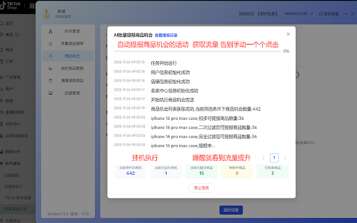 海猫主要功能(免费试用 领取F662157): √.自动提报商品机会(流量提升,告别手动) √.最低价秒杀设置(增加价格竞争力的爆单神器) √.数据罗盘榜单抓取(精准选品) √.清理滞销商品(提高动销率) √.智驾开车推广(AI调整策略,待上线) √.自动优化商品标题(AI更精准) 用海猫,让AI来为你优化店铺,免费试用,兼容市面上指纹浏览器,可用TK(美区、英欧区、东南亚 日区等等) 期待使用,商务合作请联系作者