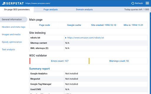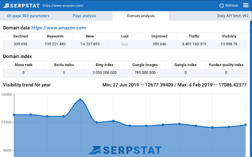 Serpstat Website SEO Checker allows you to find the key metrics of any site or page in just a few clicks. It provides you with an extensive list of SEO metrics, analysis, and tips. To examine a domain/page, you don't need to open a new tab. Click on the icon and you'll get an SEO audit of domain or page: visibility, traffic, number of keywords, top competitors in the region, etc. Three sections are now available: * On-page SEO parameters - Free Lifetime * Page analysis - Freemium * Domain analysis - Freemium Some features work without API requests to Serpstat servers so they are available without signing up, right after installation of the extension. Some reports require to sign up and get a token for API access. Serpstat Website SEO Checker makes analyzing competitors data easier than ever. The extension helps you to provide quickly a keyword research and trust me, it's much better than Keyword Planner tool. The major features: #1 On-page search engine optimization: Page Source Google Cache PageSpeed Insights Site start date Meta tags HTML tags Words Count / Symbols Count Favicon checker and many others. #2 Page analysis: Top 10 keywords in Google ranking URL that ranks for this request Ranking position for this keyword Position change and search volume Keyword CPC URL Competitors Keywords the site ranks in Missing keywords #3 Domain analysis Domain visibility Domain traffic Number of keywords Improved and declined keywords New and lost keywords PPC keywords Number of results in Google, Bing Yandex Quality Index Number of images in Google Image Search Alexa Rank. Visibility change graph In fact, we've brought together the most useful SEO features, so you no longer need a bunch of tools like Ahrefs, Semrush, Majestic and others. Keep an eye on this - it's just the beginning, you'll see many exciting updates soon. Important: To get full access to all functionality, you'll need to sign up on Serpstat.com For information regarding data collection please visit: https://serpstat.com/users/privacy-policy/