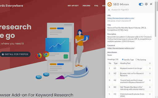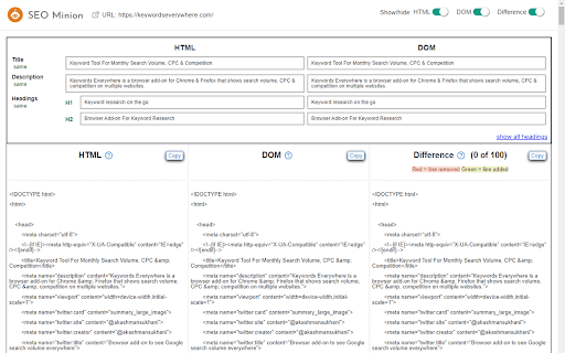 SEO Minion is available only to customers of Keywords Everywhere's Silver or higher plan. The tool helps you with the following tasks - (1) Analyze On-Page SEO - analyze the HTML of any webpage and view useful information that will help you optimize the On-Page SEO as well as alert you to any issues. (2) Highlight All Links - quickly see all the links (internal & external) for any webpage (3) Check Broken Links - check every link on a webpage and get a report of any links with issues (4) Hreflang Checker - check hreflang tag validity, as well as whether there are return tags present (5) SERP Preview - preview your website on a real Google search result and update this in real time (6) Google search location simulator - view non-personalized google search results for one keyword on two different location/language combination. (7) SERP Utilities - copy/download URLs & data from Google SERP - Organic, Advert, Local, Product, Video, Image, Fresh, News, FAQ listings & PAA data (8) HTML v/s DOM - analyze the differences between the HTML source code and the rendered DOM to check if your JS library is causing any SEO related issue (9) Analyze Structured Data - analyze the structured data on the webpage We add features based on user feedback. If you'd like us to add any new features, please email us at akash@seominion.com. You can view the change-log for every version update at https://seominion.com/news