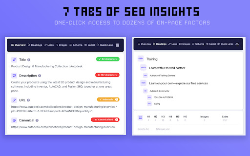 Get SEO-related insights at the click of a button to any website you're currently on. Pull back their title tag, meta description, meta robots tag and much more. Save hours of time looking through the source code of this page with our SEO analysis extension.