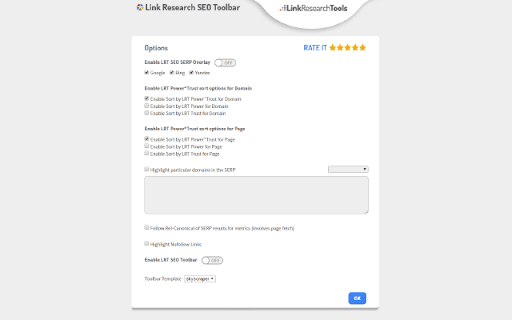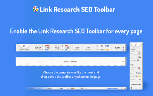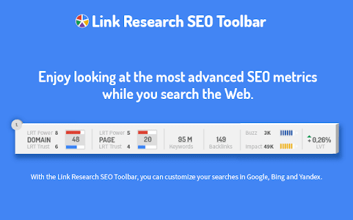 You can use the Link Research SEO Toolbar to customize your searches in Google, Bing and Yandex. You can also enable it as a page toolbar, so you look at advanced SEO metrics for every page. Here’s what you can do with the Link Research SEO Toolbar: • See the Power and Trust of a domain or page • Discover great places to get links from • See how successful a page is on social media • Understand user engagement • See the strongest pages by Keyword Ranking • Spot drastic changes in the number of links • See how many backlinks a page has. All this is possible by looking at a set of powerful SEO metrics: • LRT Power*Trust for domains • LRT Power*Trust for pages • Buzz - social media signals • Impact - long-term user engagement metrics • Keyword Ranking • Link Velocity Trends • Number of Backlinks Why LRT Power*Trust? Because LRT Power*Trust is a precise, reliable and stable metric built by LinkResearchTools shortly after the first Google Penguin update in 2012, as a result of many years of research and calculations. Forget about Google’s Toolbar PageRank. Google stopped updating it many years ago and completely removed it from their toolbar in April 2016. You can think of LRT Power*Trust as a replacement for Google’s toolbar PageRank, but it’s so much more. LRT Power*Trust is the metric to look at when you want to assess the quality and trustworthiness of a page, domain or top domain. Why Keyword Ranking? The Link Research SEO Toolbar’s “Keyword Ranking” metric allows you to take a quick look at your competitors’ keyword rankings. By evaluating the keywords your competitors rank for, you will easily come up with new ideas for your content optimization. Why Buzz? Buzz is Impactana’s aggregate of social media signals, divided into shares and likes. By using the Link Research SEO toolbar to sort the search results by Buzz, you can quickly find out what sort of content is “HOT” on social media. You can use Google’s time filter to see only the pages indexed in the past year, month or week. Why Impact? The Impact metric helps you discover strong content that people linked to a lot and engaged with by commenting or downloading it. This metric measures user engagement for any content, not only for the one that goes viral on social media. A good article about construction will not get shared on social media, but it may get many links or comments if it’s great. Why link velocity trends? A website needs to have a steady link growth. Search engines can interpret unnatural link growth as a negative signal, which can lead to a loss in the rankings. Google uses link growth trends to detect any algorithm manipulation attempts. If your backlink profile grows too fast, you’re out. If you’re too slow, you won’t ever get on the first page. Why backlinks? Google confirmed links to be a top ranking factor. That's a very strong reason to look at links whenever you analyse the strength of a page or domain. Update 0.0.3 - Now with option to follow REL-Canonicals for Metrics of pages (requires fetch) - Loading animation Update 0.0.4 NEW: SEO Toolbar for every page with all the important metrics - three different toolbar styles mini, bulky and skyscraper - drag&drop the toolbar around where you need it - open backlink checker right from the toolbar (requires LRT account) NEW: Fetch results from SERP to resolve redirects and show real SEO metrics SERP overlay - Backlink count shown for every SERP result - Sorting by backlink count in the SERPs Update 0.0.5 - Domain exclusion feature: you can now choose to disable the Link Research SEO Toolbar for certain domains. Update 0.0.6 - SERP overlay Chrome on/off settings bug fixes. - Chrome store listing updates. Update 0.0.7 - SEO Toolbar minor fixes Update 0.0.8 - Mini Toolbar load speed optimization. Update 0.0.9 - Minor layout fixes and improvements. - Added knowledge graph hint. Update 0.0.10 - We added a secret link to more cool extensions by LinkResearchTools. Update 0.1.0 - on-off toggle layout update - backlink data enhancements - try LinkResearchTools button Update 0.1.2 - Fixed issues with Google reCAPTCHA Update 0.1.3 - Fixed issues with Google SERP overlay