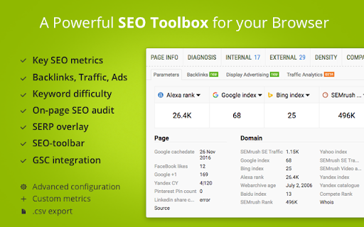 SEOquake is a free plugin that provides you with key SEO metrics, along with other useful tools such as SEO Audit and many others