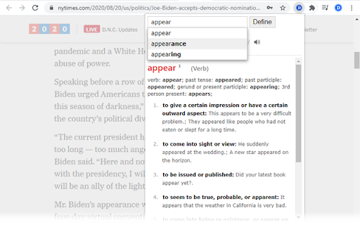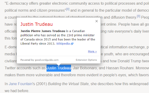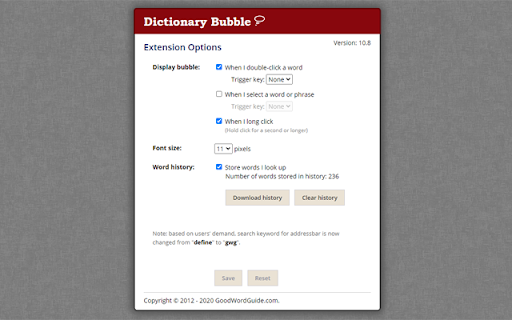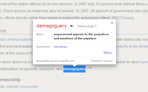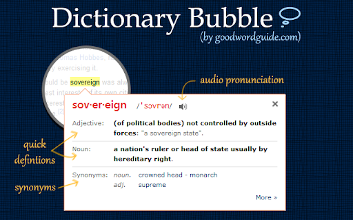 With this extension, you can: 1) Double-click any word to view its instant definition in a small pop-up bubble. 2) Lookup the complete definition of words or phrases using the toolbar dictionary. 3) Perform lookup for detailed definitions in online dictionary. 4) One click access to Google search if the word/phrase is not found in dictionary. NOTE: Currently only English Dictionary and English Wikipedia are supported. IMPORTANT: The bubble will not work in tabs that were open prior to installation; such tabs must be refreshed. Also, note that all extensions are disabled on Chrome Web Store pages (including this page). Having problems with this extension? Please fill out a problem report at http://goo.gl/Zc5e2 Join us: Twitter - twitter.com/GoodWordGuide Facebook - facebook.com/goodwordguide Google+ - https://plus.google.com/+Goodwordguide By: GoodWordGuide.com GWGDictionary.com