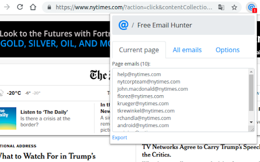 Email Extractor is a time proven email grabber tool which helps collection emails. Email Hunter easily extracts email addresses from pages as you visit them and auto saves them all. This chrome app finds email addresses scraping and searching source code and no matter what you see on the front. The functions: - extract emails from visited pages - auto search - export collected emails to text file and copy to clipboard - unsafe pages skipping without extracting emails In addition, subject to your consent through the prominent notice, we will be accessing and collecting your non-personal web browsing data to use the unsafe pages detection feature for free. The feature can be disabled on the Options page, if not - we will share the collected web browsing data in an aggregated, anonymized format with our affiliated companies and business partners for commercial use. We wish to make it clear, we do not want to know your identity, preferences or any information about you personally, all as detailed in the Privacy Policy. The Email Hunter extension helps in promoting another extension “MaxAI.me” — we open their link when installing, updating and removing the extension. Privacy Policy: https://docs.google.com/document/d/1UqcaBQLRiS44gadMRDCsfsgv4OEoYuhdW7ESAFkPa1g/