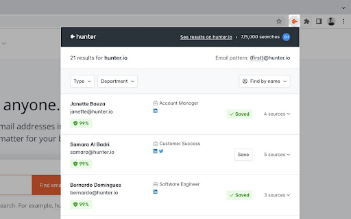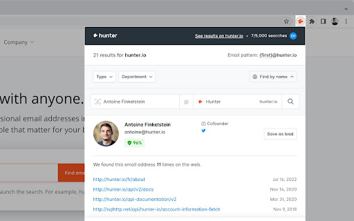 Hunter for Chrome lets you find immediately who to contact when you visit a website. ★ Domain Search The Domain Search is the most powerful email-finding tool of its kind. Click the icon in Chrome to find all the email addresses related to the website you’re visiting. It includes the most common email pattern used, department filters and the public sources. The email addresses are marked verified or returned with confidence scores. If an email address is not verified yet, you can do it by clicking the checkmark icon next to it. ★ Email Finder If you already know the name the person you would like to contact, type it in the search field. The Email Finder will return the found email address along with a confidence score and sources. If you're reading an article, Hunter's extension will look for the author's name and email address. ★ List building Click the "+" next to a person to save this lead to a list. You can send email campaigns to your leads or save them to Salesforce, HubSpot, Pipedrive, Zoho and more than a hundred other CRMs and applications. ★ Trusted by more than 3 million people Hunter (formerly Email Hunter) is used by salespeople, marketers, recruiters, bloggers, reporters and plenty of professionals who need to reach out. ★ Get started Hunter's email finder extension requires an account you can create immediately after the installation. You'll get 25 free searches/month and can upgrade your account for more. By installing the extension, you agree to Hunter's Privacy Policy (https://hunter.io/privacy-policy). Any question? Drop us a line at contact@hunter.io!