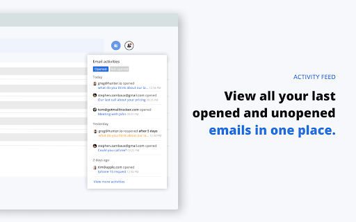 MailTracker – The Best Gmail Email Tracking Extension MailTracker is a powerful Gmail email tracker trusted by over 100,000 users. Receive real-time alerts and detailed insights whenever your emails are opened, so you can follow up at the perfect moment. With simple, one-click installation, MailTracker seamlessly integrates into your Gmail account to help you stay on top of every outbound email—scheduled or otherwise. Key Features • Real-Time Email Tracking Know exactly when and how many times your emails are opened. MailTracker’s invisible tracking pixel notifies you immediately whenever a recipient views your message. • Scheduled Email Tracking MailTracker is one of the only solutions that lets you track emails you’ve scheduled to send later. Stay informed even when your messages go out at a future date. • Multiple Inbox Support Connect all your Gmail accounts for multi-account tracking in one place. Easily switch between inboxes without losing visibility. • Individual Recipient Tracking in Group Emails Track exactly who opens your email when you send to multiple recipients. MailTracker identifies each recipient’s open activity so you can follow up accordingly. • IP Location with Link Tracking See where your recipients click links. Identify IP-based locations to gain extra insights into your email engagement. • One-Click Read Receipts Get immediate, easy-to-read confirmation of email opens—no complicated steps required. • CSV Export Export your open and click data for advanced analytics and reporting. Perfect for teams that want in-depth metrics or need to integrate with other tools. • Privacy-Friendly & GDPR-Compliant We never read your emails, store IP addresses, or share data with third parties. MailTracker is fully GDPR-compliant and undergoes Google-audited security checks for a trustworthy experience. • No Branding or Signatures Keep a professional, ad-free look: we don’t add logos or footers to your outgoing emails. • High Deliverability By sending directly through your native Gmail account (not a separate API), MailTracker ensures high deliverability so your emails are less likely to end up in spam. Instant Alerts & Reminders Get real-time alerts via email or Chrome notifications the moment your message is opened. You can also receive reminders if an email remains unopened for 48 hours, ensuring you never miss an opportunity to re-engage. Email Activity Feed Access a centralized, up-to-date feed of all recently opened emails. Easily spot which messages remain unopened and follow up with a single click. Fully Integrated with Gmail 1. Compose Window: Toggle tracking on/off for each new email (including scheduled ones). 2. Inbox View: Instantly see which messages are read or unread via MailTracker icons. 3. Conversation View: Review the complete open history and details right inside Gmail. Free Plan & Premium Options • Free Plan: Track up to 20 emails per month with unlimited history, alerts, and notifications. • Premium Plans: Unlock unlimited tracking across multiple Gmail accounts. All premium plans include every feature—choose the plan that fits your team size and workflow. Use Cases • Timely Follow-Ups: Send a friendly nudge when you see your prospect or client has opened (or not opened) your email. • Job Interviews: Know if a recruiter or hiring manager has viewed your resume or follow-up messages. • Quotes & Invoices: Verify when your clients receive crucial payment information and respond promptly if needed. • Real Estate Agents: Track property listings or contract details you’ve shared, so you can engage clients at the right moment. • Prospecting: Monitor opens and clicks during email outreach campaigns to optimize your sales or lead generation efforts. Frequently Asked Questions (FAQ) How do I know if someone opens my email? MailTracker adds an invisible tracking pixel to your email. As soon as your recipient opens it, we detect that event and send you an alert (via email or Chrome notification). How does Email Tracking work? When an email is opened, the tracking pixel loads on the recipient’s device. We record the open event, the time, and the device used—without ever accessing the content of your email. Can someone see if I use an email tracker? MailTracker doesn’t insert visible branding or signatures, so recipients generally won’t notice. However, some users may have browser or email security settings that detect trackers. MailTracker is designed to be discreet, but full invisibility cannot be guaranteed if a user’s security software flags all tracking pixels. Why Choose MailTracker? • Built by Hunter.io: A leading email-finding platform with over three million users and trusted by companies like Google, IBM, Adobe, and Microsoft. • Simple Setup: Quick Chrome extension—no technical expertise required. • Data Privacy & Security: We never store or read the content of your emails. • Proven Reliability: Over 150,000 active users rely on MailTracker for precise email open tracking and link click insights. How MailTracker Works MailTracker adds a tiny, invisible image to your outbound emails. When your recipient opens the email, that image loads, allowing us to instantly inform you. We also detect the device type—desktop, mobile, or tablet—for better engagement insights. Ready to Elevate Your Email Outreach? Install MailTracker today and experience a new level of efficiency and clarity in your Gmail. Stay on top of every conversation, know exactly when to follow up, and take full control of your email communication—even for scheduled messages! Website: https://getmailtracker.com Twitter: @getmailtracker Make every email count with MailTracker—the easiest, most secure way to see who’s opening your Gmail messages.