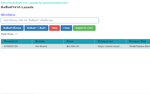 เวอชั่น 3.1 แก้ไขดึงสินค้าตาม lazada อัพเดท เวอชั่น 3 แก้ไขดึงสินค้าตาม lazada อัพเดท เวอชั่น 2.13 แก้ไขดึงสินค้าตาม lazada อัพเดท เวอชั่น 2.12 เพิ่ม Export to Shopee เวอชั่น 2.11 แก้ไขดึงสินค้าตาม lazada อัพเดทใหม่ เวอชั่น 2.10 แก้ไขดึงสินค้าตาม lazada อัพเดท เวอชั่น 2.9 แก้ไขดึงสินค้าตาม lazada อัพเดท เวอชั่น 2.8 เพิ่มแสดงจำนวนสินค้าที่หาเจอในแต่ละหน้า เวอชั่น 2.7 เพิ่มดึงรูปให้ได้เยอะขึ้น เครื่องมือดึงข้อมูลของ Lazada - เครื่องมือดึงข้อมูลอย่างง่าย ๆ ของผลิตภัณฑ์ราคาอันดับขายการตรวจทาน ส่วนขยายโครเมียมนี้ช่วยให้คุณสามารถดึงรายละเอียดเว็บเพจของ Lazada (สิงคโปร์ มาเลเซีย ไทย อินโดนีเซีย และเวียดนาม) ให้อยู่ในรูปแบบ excel ที่สามารถแก้ไขได้ ตอนนี้คุณสามารถใช้ส่วนขยายนี้เพื่อแยกรายชื่อผลิตภัณฑ์ของคู่แข่งแบรนด์ผลิตภัณฑ์ในสเปคผลิตภัณฑ์ใด ๆ ตรวจสอบลูกค้าของผลิตภัณฑ์เฉพาะ วิธีใช้ : 1. ไปที่ Lazada.com (เช่น Lazada ) 2. พิมพ์คำหลักใด ๆ ในแถบการค้นหาเช่นชื่อแบรนด์คำหลักผลิตภัณฑ์ ... ฯลฯ 3. ใช้ตัวเลือกการกรองเพื่อปรับแต่งผลลัพธ์การค้นหาและคลิก Enter 4. เมื่อแสดงผลการค้นหาให้เปิดส่วนขยายของ chrome และคลิกเริ่ม ข้อมูลจะถูกแยกในรูปแบบ excel สิ่งที่คุณได้รับประโยชน์จากผลิตภัณฑ์นี้: - การวิเคราะห์คู่แข่ง: แยกรายการผลิตภัณฑ์ทั้งหมดอันดับการขายและข้อมูลราคาในรูปแบบ excel สำหรับการวิเคราะห์เพิ่มเติม - อนุญาโตตุลาการค้าปลีกออนไลน์: แยกข้อมูลจำเพาะผลิตภัณฑ์ของผลิตภัณฑ์ราคาต่ำสุดใน excel และรายการไปยังตลาดอื่น - รู้จักลูกค้าของคุณ: ดึงความเห็นของลูกค้าเกี่ยวกับผลิตภัณฑ์เฉพาะ - การวิจัยตลาด: ทำความเข้าใจกับจำนวนผู้ค้าปลีกและคู่แข่งที่ขายผลิตภัณฑ์เดียวกันและในตลาดเดียวกัน - การตรวจสอบช่องทางการขายที่ไม่ได้รับอนุญาต: โดยการแยกผลิตภัณฑ์และข้อมูลรายชื่อคุณสามารถระบุรายชื่อผู้ขายที่ด้านล่างราคาตัวแทนจำหน่ายได้ง่ายเพื่อระบุผู้ค้าปลีกที่มีศักยภาพที่มีการนำเข้าขนานหรือผลิตภัณฑ์ปลอม คุณสามารถดึงข้อมูลใดได้บ้าง: - คุณสมบัติของผลิตภัณฑ์ - ราคา - ราคาขายและรายละเอียด - อันดับการขาย - ภาพผลิตภัณฑ์ - รีวิวลูกค้า ประเภทผลิตภัณฑ์ที่รองรับ: - ทุกประเภท รองรับจำนวนข้อมูล: - ไม่มีข้อ จำกัด การสนับสนุนทางเทคนิค : เรายินดีรับฟังความคิดเห็นหรือความคิดเห็นเพื่อปรับปรุงผลิตภัณฑ์ กรุณาติดต่อ: mail.weloveshopee@gmail.com.com ผู้พัฒนา: www.weloveshopee.com Privacy Policy https://www.weloveshopee.com/term.php