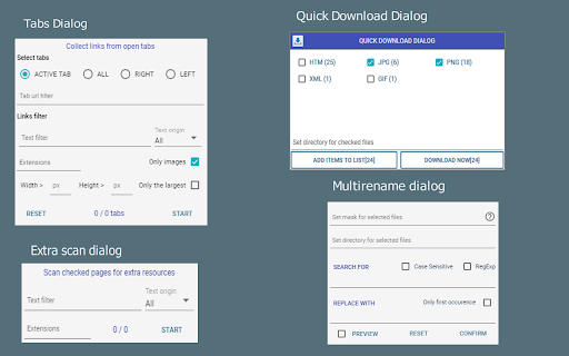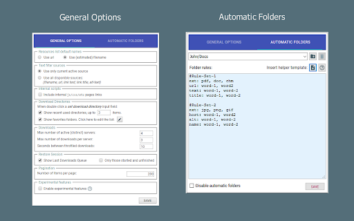 This is a light and unobtrusive chrome download manager and batch/bulk/mass downloader. Good for: Assist the user in batch downloading various resources from the web: ● extract from the bulk links of web pages only desired ones (advanced filtering system) ● give better names for downloading files using the contextual info available for the corresponding links (name masks system) ● organise downloads by directing them to appropriate custom folders (favorite or automatic folders) NOT so good for: ● downloading streaming media or embedded videos ● heavily javascripted sites where download links are generated "on the fly" (on user clicks) so my extension cannot see them in advance for objective reasons) MAIN FEATURES: ● The links may be extracted from active tab / multiple open tabs or from selected text on web pages. Also from the clipboard or a local file or a pattern URL. ● Advanced filtering/mass renaming capabilities using various name masks. Also with user-defined categories for resource filtering. ● For images, there is a special thumbnails grid view where items may be ordered by the size or filtered by width/height. ● Flexible routing system: the user can set Automatic Folders where downloads are automatically directed based on custom rules. ● User-defined Favorite Folders, easily accessible when the user needs a custom download directory. ● Flexible download management, the user can: a) pause, resume, open downloaded files, etc. (usual features) b) set server limits or force sequential downloading mode. ● The URL list can be exported using various name masks Please, note that ● Development is mainly done in Windows, with limited testing in Linux. No testing possibilities on MacOS, sorry. ● Before using, please verify that "Ask where to save each file before downloading" option in Chrome Download Settings is NOT checked. Otherwise, a lot of "Save As" dialog boxes will pop up, defeating the main purpose of this extension (or any other mass downloading chrome extension).