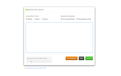 Open multiple URls at once with single click. You can also add delay in opening each url. if delay = 0 Opens all urls immediately if delay > 0 Opens each url after mentioned delay -That's all folks! Version 0.5 --------------- You now can get all links from opened tabs and put them in in list on multiple url opener. Version 0.3 --------------- Now you can: Don't lose focus when opening links. (This is to not bring chrome to front while opening links.) Skip duplicate links Version 0.2 --------------- Delay in decimal points: 0.5, 1.5 etc Able to save links in database so you don't have to enter them again.