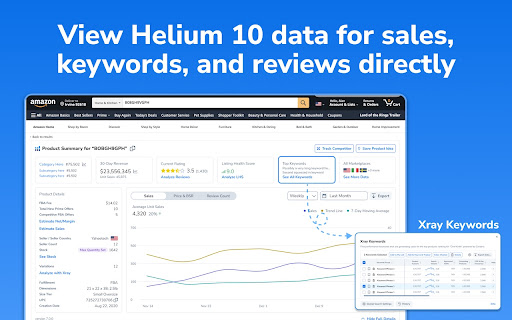 Find your next winning product and scale your business more efficiently with a free trial of this powerful Chrome Extension tool for Amazon FBA and Walmart sellers. Trusted by over 1,000,000 sellers, the Helium 10 Chrome Extension is designed to help you… ✓ Leverage powerful data to assess market demand and validate product opportunities ✓ Discover new product niches with upfront search-volume data ✓ Identify new keyword opportunities to optimize your listings and PPC campaigns ✓ Gain a comprehensive overview of your competition ✓ Analyze customer sentiment with Review Insights ✓ Calculate potential profit margins with Profitability Calculator Simplify Product Research with Xray Search for a product and launch Xray on Amazon or Walmart to unlock vital niche sales data that can help you identify winning product niches. Eliminate uncertainty and back your business decisions with accurate data to assess competition and demand. Get Powerful Keyword Insights with Search Expander and Xray Keywords Enrich your Amazon search experience with Search Expander to quickly generate powerful long-tail keywords and discover new product niches. Or use Xray Keywords to discover top keywords that are driving organic sales to your competitors. Increase Your Productivity with ASIN Grabber Use ASIN Grabber to extract product ASINs in bulk to create targeted product ads in Amazon and more. Estimate Margins on the Fly with Profitability Calculator Gauge a product’s potential sales success with the Profitability Calculator. Generate accurate sales margins and ROI by assessing all the fees and costs associated to make better sourcing decisions. Spy on Your Competitors' Listing Stock with Inventory Levels Spy on your competition’s available units for sale with Inventory Levels. Discover who your real competitors are and if you have any potential hijackers on your listing. Get into Shoppers' Minds with Review Insights Instantly capture product sentiment and feedback with Review Insights. Extract reviews from any product to uncover customer pain points, product weaknesses, and much more. Find Suppliers on Alibaba.com with Supplier Finder Use Supplier Finder, powered by our partner Alibaba.com, to find quality product suppliers faster and easier while conducting your research on Xray for Amazon or Walmart! Assess Product Demand on Amazon with Demand Analyzer Verify potential product niche opportunities on Amazon while browsing for inspiration on Alibaba.com or any Shopify website. Input a seed keyword to get a high-level overview of product demand indicated by top-related keyword search volume and similar top-performing products. ____________________________________________________________________________ Download the Helium 10 Chrome Extension today and try it FREE to get the insights you need to grow your business to new heights in less time than ever before. ----------------------------------------------------------------------------------------------------------------------------- Helium 10 is dedicated to developing tools designed to enhance the Amazon selling experience. Get over a dozen tools specialized in every part of the seller journey, including: Product Research Find highly profitable product opportunities in every category. Keyword Research Strategic research tools to improve your product rank and drive traffic. Listing Optimization Tools to create high-ranking listings & optimize existing listings. Product Launches & Marketing Build and grow the marketing and PPC strategy for your products. Operations & Analytics Manage everything with streamlined tools to run your business and easily monitor the performance of your products. ----------------------------------------------------------------------------------------------------------------------------- For more information on how to use the Helium 10 Chrome Extension: https://kb.helium10.com/hc/en-us/sections/360005055314-Helium-10-Chrome-Extension
