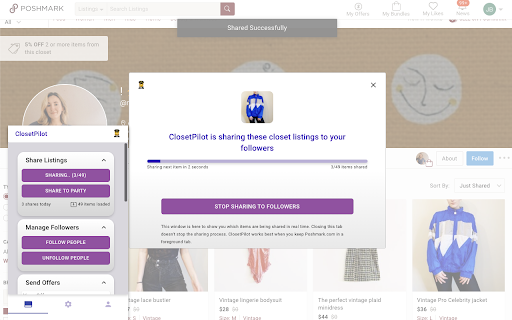 ClosetPilot is the #1 automation tool for Poshmark. It drives more sales for your business, and helps you get more followers and more shares for your Poshmark inventory. ClosetPilot now offers a FREE FOREVER plan, where you can share 100 items a day at no charge, no payment information required. Do you share your closet 2-3 times per day? Instead of manually sharing every single item, ClosetPilot will help you share your inventory automatically, saving you valuable time so you can focus on sourcing inventory and talking to customers. Have you looked into hiring a Virtual Assistant to share for you? Hiring a VA to share your closet can be expensive, often costing upwards of $100 per month. Try ClosetPilot for free and see how much more effective it is than hiring a VA. ClosetPilot pops up when you are on poshmark.com and it allows you to automatically: - Share items to your followers, or to parties - Share items from any closet or feed - Follow and unfollow people, so you can gain more followers - Send offers to likers of your items - Return Shares and Follows received from others - Edit and Share your Listings - Re-arrange the items in your closet - Automatically solves 100 free captchas per day (and unlimited captchas using the 2Captcha.com service) - Lets you set a daily share limit so you don't get soft banned You can save hours per day by using ClosetPilot. Give it a try. NEW in ClosetPilot: you can now automatically share your items without needing the Poshmark.com website open. Use our new AutoPilot feature, which allows ClosetPilot to share your closet on Poshmark completely in the background, 100% hands free. As long as your computer is on and Google Chrome is running, ClosetPilot will be sharing your closet on your behalf. Supported in the USA and Canada . Data usage disclaimer: ClosetPilot collects your email and password when you create an account, which allows you to log in to your ClosetPilot account. When you start a subscription, our extension uses a 3rd party payment processing company called Stripe to collect your payment information. Stripe may also collect information about your location in order to identify and prevent fraudulent payments. POSHMARK is a registered trademark of Poshmark, Inc. ClosetPilot is not affiliated with, endorsed by, sponsored by or otherwise related to Poshmark, Inc. or any of its affiliates or subsidiaries.