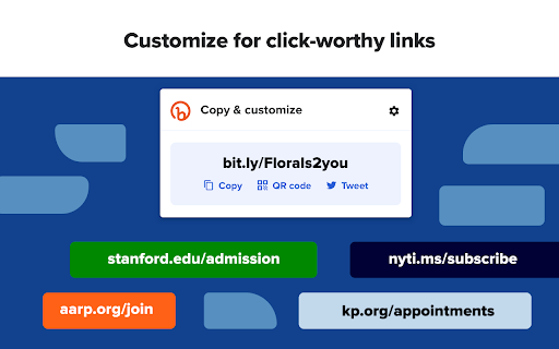 Connect with your audience and drive more viewers to your content with Bitly’s powerful connection platform. Create short links and QR Codes right from any page. Shorten links with one click Click the Bitly button in your toolbar to create a unique link to the current URL. Your shorter, more memorable link is copied to your clipboard and ready to paste into a post, message, or document. Customize for click-worthy links Is that bit.ly link too generic for you? Customize it by editing the back-half. Then take it to the next level by upgrading your account and replacing the generic "bit.ly" domain with your own brand. Generate QR Codes Create QR codes for print, outdoor, and other ad campaigns. With Bitly, a static QR Code will never get stale—just redirect it when your content changes.