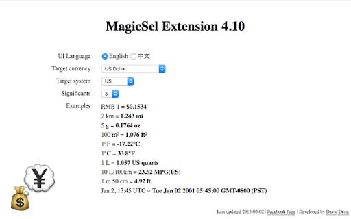 如果你经常关注国外新闻、喜欢在国外网站上购物或者喜欢看各公司的财报,但是你对于美元、欧元、华氏度、英尺这样的单位没有感觉,每次都需要心算一下做转换,那么你应该安装这个扩展! 使用方法:安装扩展后,使用鼠标选中要转换的文字(包括单位)就会自动进行转换。(初次安装原来打开的页面需要刷新)可参看截图。 主要功能: 1) 外币转成人民币:现支持所有中国银行网站上的外币,美元、英镑、欧元、港币、日元等。汇率后台自动从中国银行网站抓取更新; 2) 长度面积单位转换:英寸转厘米,英尺/码转米,平方英尺/英里转平方米/公里,英里转公里; 3) 温度单位转换:华氏与摄氏互转; 4) 重量单位转换:英磅转公斤,盎司转克; 5) 容量单位转换:盎司转毫升,加仑转升; 6) 汽车相关转换:英里每加仑(MPG)转升每百公里,英里每小时转公里每小时 7) 以上各种转换同时支持繁简体中文和外语,反向转换。支持两个单位的累加,如 5'8"。支持分数,如1 1/2"。 8) 各时区时间转成当地时间。
