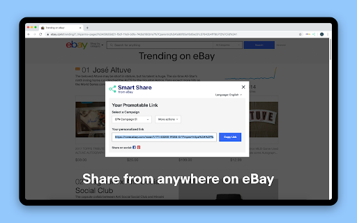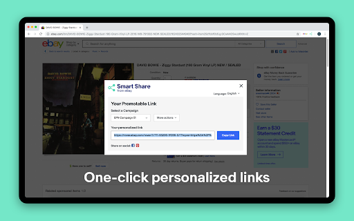 Smart Share instantly creates personalized affiliate links to eBay listings for you as you browse so that you can directly share on Facebook or Pinterest, or copy and paste the links to share and earn wherever you publish online. Work smarter, not harder. With Smart Share, you can: 1. Increase your earning potential. The more links you share, the more commissions you can drive. 2. Harness the power of social. In one click, promote listings, deals, categories, brands, and more directly to your Facebook or Pinterest audience. Stay tuned: More social networks are on their way. 3. Enjoy the freedom to choose where you share. Share directly to Facebook or Pinterest, or copy and paste your unique link wherever you choose online. 4. Manage campaigns on-the-go. Without logging into the EPN portal, you can tie each link you create back to one of your existing campaigns for better organization and reporting. To earn commissions with Smart Share from eBay, you need to be a member of the eBay Partner Network. Signing up is easy, fast and free. Join now at https://partner.ebay.com