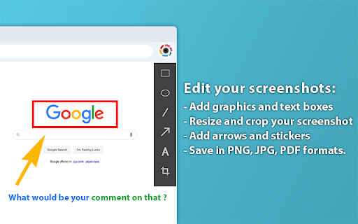 An easy-to-use, yet functionally powerful screenshot tool! Lets you capture the whole page screenshot with just one click. It works just like the native feature of Google Chrome to capture screen but in a more optimized way. ✍ Advantages: ☑︎ Easy and user-friendly interface ☑︎ No restrictions on use ☑︎ Create full-page screenshot ☑︎ Create visible area screenshot ☑︎ Keyboard Shortcuts ☑︎ Best Quality, High-Resolution screenshots, PNG, JPG, and WEBP formats. Built-in image editor is an added feature of this extension. You can use the simple image editor, which offers a dozen different features. ✍ Screenshot Editor features: ☑︎ Write text ☑︎ Cropping ☑︎ Use arrows ☑︎ Include rectangular boxes or lines ☑︎ Saving in PNG, JPG, and WEBP formats.