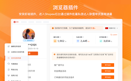 功能简介: 1、自动批量私信达人文字、商品卡,每天触达上万达人。 2、可设置定时私信任务,系统会在预设的时间点自动执行私信,商家可以确保信息在达人所在时区的活跃时间段内被接收。 3、批量私信订单买家,提高店铺评分。卖家真实反馈:订单取消率降低40%,好评率提高30%,新品曝光提高300%,店铺复购提高30%。 4、可选择是否跳过已联系的达人,避免重复联系相同达人 5、可自定义达人黑名单,会自动跳过黑名单的达人,从而避免与不良联盟伙伴合作。 6、可指定达人发送,支持导入达人excel表或者输入达人ID后对指定达人发送私信内容。 7、支持跨境店铺及本土店铺,覆盖台湾、新加坡、马来西亚、泰国、越南、菲律宾、巴西等多个市场,为您打开更广阔的商业机会 核心亮点: ● 自动化运营:实现在线私信邀约的自动化,单店铺场景下2小时建联1万人,效率提升500%。 ● 操作便捷 :不占用剪切板及鼠标,让您能专注于工作邀约,无需分心处理操作细节。 ● 全天候服务: 提供7x24小时不间断的邀约服务,充分利用时间优势,让每一刻都创造价值。 ● 跨平台兼容:适配全网指纹浏览器,确保广泛的兼容性和稳定的运行体验。 ● 全球化支持:跨境和本地店铺一并支持,为您在不同市场中获得竞争优势。 --- #虾皮联盟营销工具 #虾皮达人邀约工具 #虾皮达人私信工具 #虾秘 #紫鸟浏览器 #站斧浏览器 #Shopee 达人私信RPA工具 #Shopee #虾皮#Shopee#知虾#达秘#达卖#达连