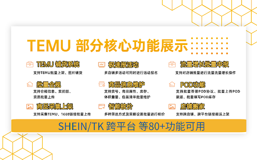 【功能介绍】 ✅️智能核价:支持商家提前设定好核价策略,开启自动核价任务后,客户端会定时按照策略去帮助商家去重新核价,根据不同核价玩法可实现快速核价和高利润核价 ✅️批量活动申报:支持商品批量筛选,批量设置活动价格和库存,一键批量报名TEMU的各种活动。 ✅️商品采集上架:支持采集TEMU、1688链接批量上传 ✅️TEMU铺货系统:支持图片铺货,批量上架 ✅️店铺搬家:支持把TEMU一个店铺的所有商品都快速原封不动的搬到另一个店铺中;同时支持跨平台搬家,TEMU/SHEIN/TIKTOK平台链接可实现互搬,可以帮助商家快速起新店,快速上品 ✅️智能抢仓:自动智能抢仓,支持多店铺同时操作 ✅️合规中心:批量更新商品实拍图,批量上传合规信息,批量上传商品资质,一键设置商品识别码,批量填写清关属性 ✅️财务板块:支持一键查看销售数据、售后扣款详情、经营概览以及进行利润计算等功能 ✅️TEMU商品信息维护:支持批量维护商品货号、包装清单、SKU分类管理;批量修改JIT商品库存、商品体积重量 ✅️POD功能:支持批量签署POD协议、批量上传POD蒙版、批量填写POD库存 ✅️一键导出数据:支持一键导出备货单、发货单、收货单、库存数据等多种表格 ✅️库存管理:支持本地库存管理、一键修改半托管库存、查看本地库存出入明细、TEMU库存统计 ✅️商品管理:批量更新标题、更新sku预览图、更新skc轮播图、上传说明书、更新详情图文、填写零售价、发布站点、商品下架、刷新sku价格、活动下架;定时批量拒绝调价,视频批量更新,导出竞价商品表格 ✅️备货单管理:一键加入发货台,一键创建发货单,批量作废/取消备货单 ✅️店铺营销:批量开启流量增长,批量创建优惠券,按期望金额批量配置优惠券 ✅️跨境工具:跨境翻译、实时汇率、跨境日历、单位换算、1688寻货源、批量抠图、标签模板、图生标题、违禁词库 【服务介绍】 ❤️功能齐全:TEMU全功能覆盖、SHEIN、TIKTOK、AMAZON跨平台功能等80+功能可一站式完成店铺运营,更有30+全店免费功能可用。 ❤️功能上新速度快:及时响应用户痛点和需求反馈,功能上新速度快,平均一周上新3-5个用户需求功能,优化10+功能需求。 ❤️运行维护有保障:凌风工具箱配备了专业的运营团队及工程师团队,用户反馈及时响应迅速处理,成立至今已为10W+跨境用户提供服务及保障 ❤️品牌优势值得信赖:凌风工具箱目前是TEMU垂直工具类头部服务商,并持续不断进行新领域开辟中。