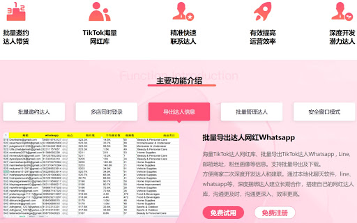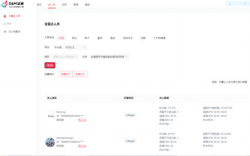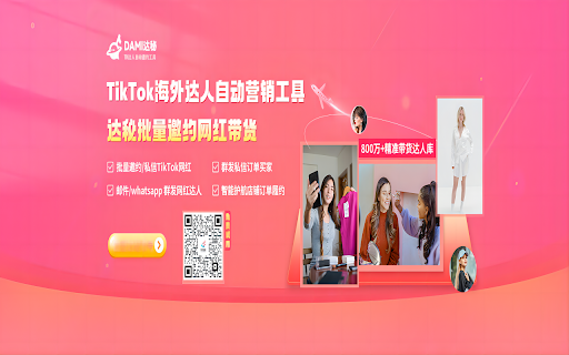 达秘主要功能 1、自动批量邀约/私信达人,每天触达上万达人 2、自带1000万+精准带货达人库(独家) 3、自带1000万+达人带货短视频素材库(独家) 4、批量私信订单买家,提高店铺评分(独家) 5、邮件批量群发达人,站内站外双通道邀约 6、查看竞品、店铺带货达人,达秘一键触达(新) (一键建联竞争对手店铺/商品带货达人) 7、客户端+浏览器插件,多店铺、多账号、多设备同时运行,安全稳定 Dami TikTok Tool boosting your sales. Automatically sending message, target collaboration,and emails to reach creators. Send 10000 automated invitations. Reach 50000 affiliates in a week. Up to 500% increase on your efficiency. The best tool for TikTok Shop Affiliate .