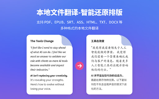 全网口碑炸裂的 AI 网页翻译插件【沉浸式翻译】⭐⭐⭐⭐⭐ AI 术语库功能上线,AI 翻译支持自定义术语啦 功能特性如下: 网页翻译 - 通过智能识别网页主内容区域进行双语对照网页翻译,降低对原网页的“侵入性”,带给你更好的外文网页翻译和阅读体验,因此得名【沉浸式翻译】; - 深度定制优化主流网站翻译,针对 Google、Twitter、Reddit、YouTube、Facebook、彭博社、华尔街日报等主流网站翻译进行优化,无论是搜索、社交还是获取资讯,都更加流畅高效; - 鼠标悬停翻译功能,仅需将鼠标停留在任意网页的任意段落上,相应的译文就会立即出现在段落下方。段落在【沉浸式翻译】的设计理念中被视为最小单位,保留其上下文,这样我们才能真正理解并学习外语; - 划词翻译,AI 时代的划词翻译不再是简单的查字典,结合上下文给你最贴合当前语境的词语解释; - 网页输入框翻译,在任何网页上的输入框输入你的母语三连击空格,立即将你输入的内容翻译成你所设置的目标语言,立刻解锁跨语言谷歌搜索,ChatGPT 等工具的双语实时对话体验; 文档翻译(支持选择双语对照/单译文版本下载) - PDF翻译(保留原文档格式排版),进阶版更是支持PDF中的各类复杂的公式识别、表格识别、图片OCR识别,最大限度的保证译文保持原文格式排版,适用场景包括但不限于:外文文献PDF翻译,论文PDF翻译,产品说明书PDF翻译等; - 同时还支持一键EPUB电子书翻译、TXT文档翻译、HTML翻译、字幕文件翻译(ASS/SRT); 视频双语字幕翻译 - 主流在线视频站点自动双语字幕翻译(Youtube、Netflix、Vimeo、Hulu、Bilibili、TED、Twitter Spaces等数十家在线视频站点),一键翻译打破语言壁垒与全球各种语言的文化思想碰撞; - 在线视频会议翻译,已适配 Google Meet, Zoom, Microsoft Teams ; ⚔️漫画翻译 - 支持特定在线站点漫画翻译,帮助非母语漫画的爱好者无障碍啃日漫、韩漫、美漫生肉,第一时间阅读最新章节; ️ 图片翻译 - 告别传统网页图片先保存到本地再上传翻译的模式,直接网页右键即可在不打断网页浏览的情况下实现网页图片翻译。除此之外同时也支持上传本地图片翻译; 【沉浸式翻译】AI 翻译特色功能 - AI 专家 - 支持设定 AI 特定行业身份,对特定领域内容进行更专业的翻译; - AI 术语库 - 支持设置自定义术语库,让 AI 翻译内容中的特定术语时采用术语库中的翻译,进一步增加翻译的准确性; - AI 智能上下文翻译 - 系统会先理解全文语境和专业术语再进行翻译,为您带来更准确的翻译体验。(Bate阶段) 其他特性 - 全平台支持,除了各大桌面端浏览器,移动设备也可享受同样的沉浸式翻译体验。在 iOS Safari、安卓 Kiwi 浏览器、狐猴浏览器、X浏览器等移动端浏览器上轻松实现双语浏览 Twitter,Reddit 等社交媒体。 - 目前已支持的翻译引擎如下: (微软翻译、谷歌翻译、DeepL、Deepseek、OpenAI (ChatGPT)、Yandex、Gemini、Claude、腾讯交互翻译、有道翻译、腾讯翻译君、阿里云翻译、Azure翻译、百度翻译、火山翻译、彩云小译、OpenL、小牛翻译等) 联系我们 - 使用过程中有任何问题或建议,都可以联系我们的客服邮箱反馈; 邮箱: support@immersivetranslate.com ❤ 沉浸式翻译扩展的初心:希望能帮大家打破语言障碍,轻松、愉悦、优雅地获取互联网上丰富的外文信息; ❤